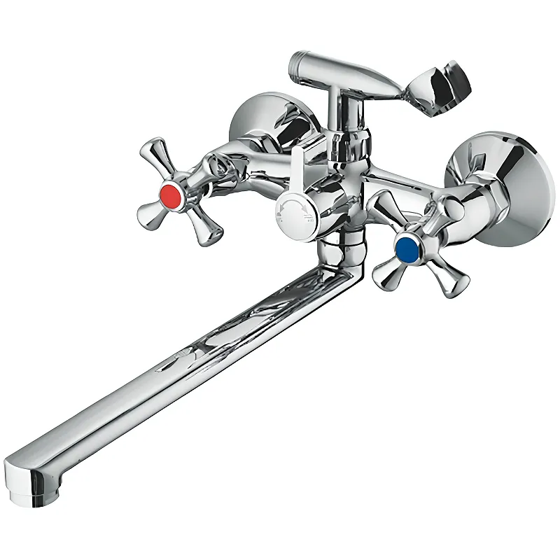 Смеситель для ванны Viko V-1515 универсальный, с душевым гарнитуром.Характеристики: Цвет: хром. Материал: латунь. Управление: двухвентильное. Механизм: керамическая кран-букса. Излив: поворотный. Монтаж: на стену. Тип подводки: жесткая. Стандарт подводки: G 1/2. Длина шланга: 1500 мм. В комплекте поставки: Смеситель для ванны. Душевой шланг. Душевая лейка. Отражатели: 2 шт. Эксцентрики: 2 шт. Комплект прокладок.
