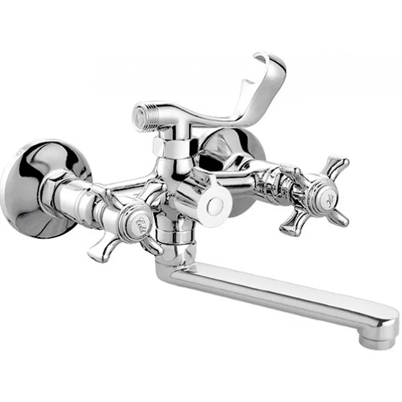 Смеситель для ванны Viko V-2122 с душевым гарнитуром.Характеристики: Цвет: хром. Материал: латунь. Управление: двухвентильное. Механизм: керамическая кран-букса. Излив: поворотный. Монтаж: на стену. Тип подводки: жесткая. Стандарт подводки: G 1/2. В комплекте поставки: Смеситель для ванны. Душевой шланг. Душевая лейка. Держатель лейки. Отражатели: 2 шт. Эксцентрики: 2 шт. Комплект прокладок.
