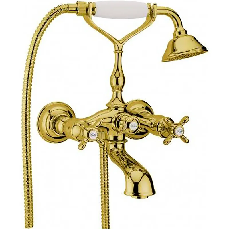 Смеситель для ванны Webert Ottocento OT720201010.Характеристики: Цвет: золото. Цвет ручки: белый. Материал: латунь. Монтаж: настенный. Отверстия для монтажа: 2. Управление: вентильное. Тип излива: фиксированный. Механизм: керамический катридж. Стандарт подключения: 1/2. Тип подводки: жесткая. Длина шланга: 1500 мм. В комплекте поставки: Смеситель. Душевой гарнитур.