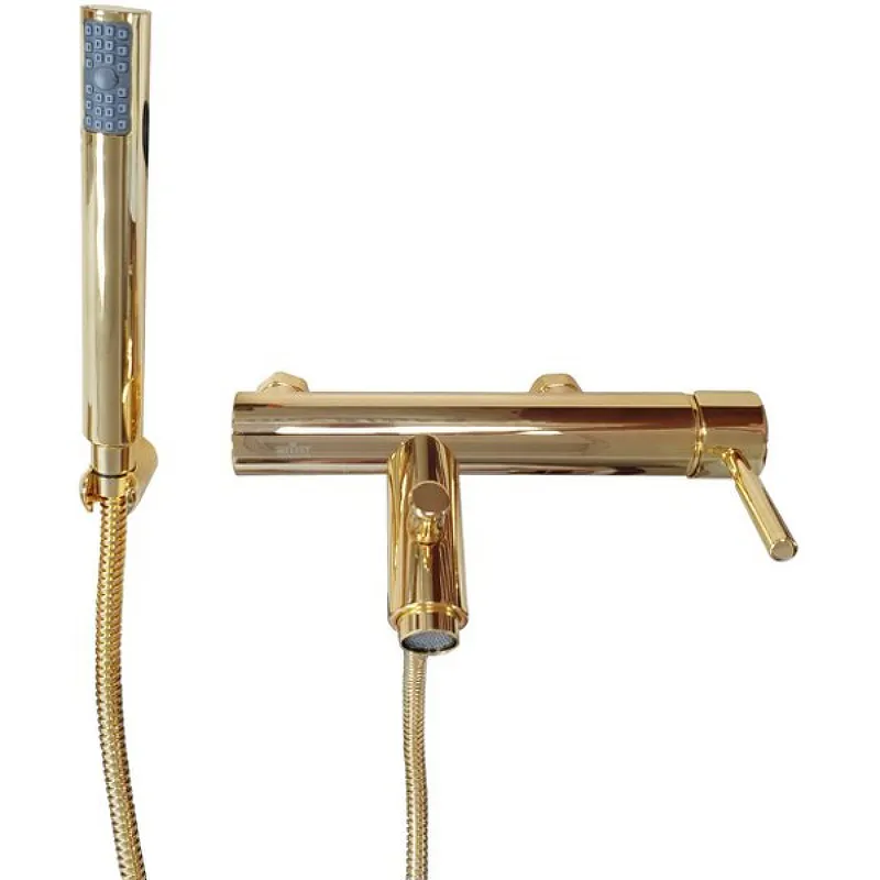Смеситель для ванны Webert Rimini RI850101010 с душевым гарнитуром.Характеристики: Цвет: золото. Материал: латунь. Управление: однорычажное. Тип излива: традиционный. Механиз: керамический катридж. Тип подводки: жесткая. Стандарт подводки: 1/2. Длина шланга: 1500 мм. Исполнение шланга: металл. Монтаж: на стену. Отверстие для монтажа: 2. Количество режимов струи: 1. В комплекте поставки: Смеситель. Душевой гарнитур Инструкция.