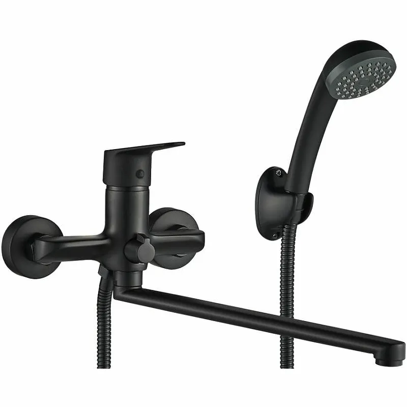 Смеситель для ванны WesnaArt Nova NOV03-320Black универсальный.Характеристики: Цвет: черный матовый. Материал: латунь. Управление: однорычажное. Механизм: керамический картридж 35 мм c противошумной вставкой. Излив: поворотный. Аэратор. Керамический дивертор 90 градусов. Душевой шланг в оплетке из нержавеющей стали Double Lock, длиной 1.5 м. Количество режимов струи ручного душа: 1. Функция экономии расхода воды. Стандарт подводки: 1/2. Отверстия для монтажа: 2. Монтаж: на стену. В комплекте поставки: Смеситель для ванны. Ручной душ. Душевой шланг. Настенный держатель ручного душа. Эксцентрики. Отражатели.