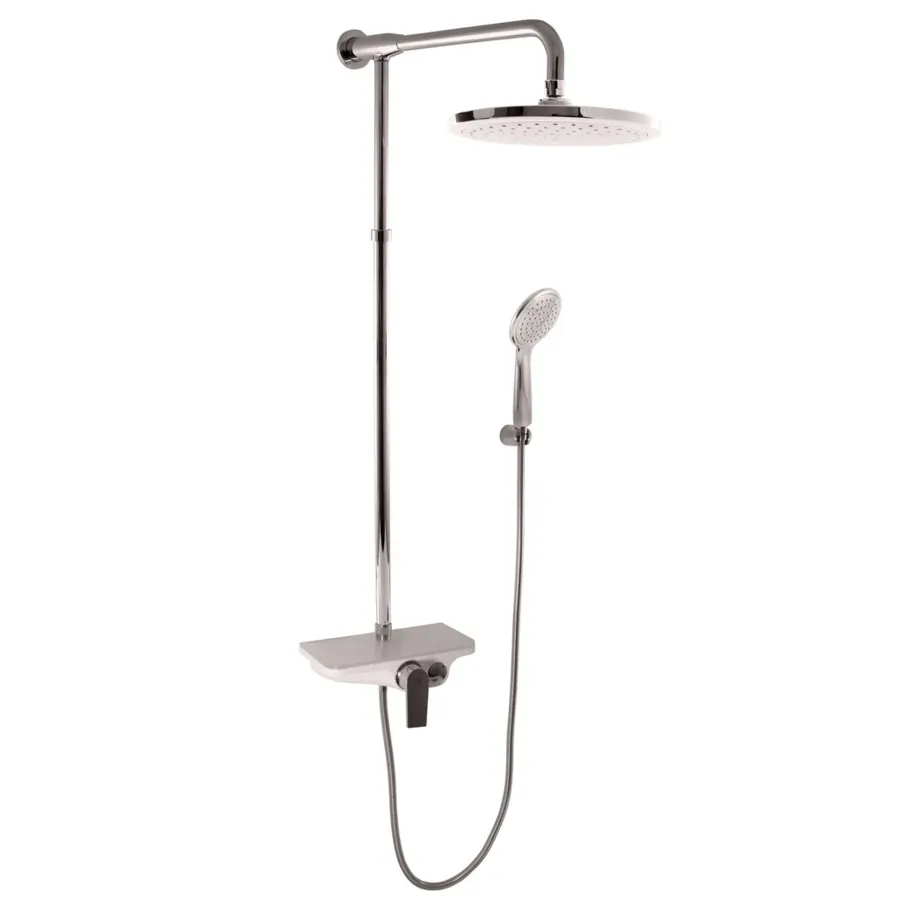 СмесительМонолитный с белой полочкой, пласт.телескопической штангой, керамический переключатель KA3502 душевая лейка потолочная в комбинации белая/хром