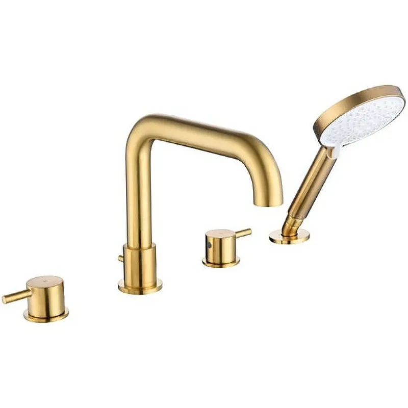 Смеситель на борт ванны Caprigo Don 53-410-BRG.Характеристики: Цвет: золото матовое. Материал: латунь. Управление: двухвентильное. Механизм: керамическая кран-букса. Излив: фиксированный. Аэратор. Материал ручного душа: ABS-пластик. Диаметр лейки ручного душа: 120 мм. Количество режимов струи ручного душа: 2. Переключение режимов ручного душа: флажковое. Стандарт подводки: 1/2. Отверстия для монтажа: 4. Монтаж: на борт ванны. В комплекте поставки: Смеситель. Душевой шланг. Ручной душ. Держатель ручного душа.