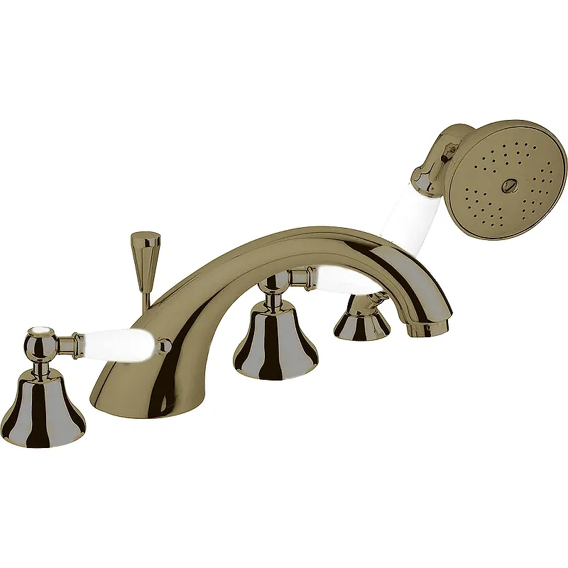 Смеситель на борт ванны Cezares First-BVD-02-Bi.Двухвентильный смеситель с фиксированным изливом и аэратором, монтируемый в четыре отверстия. Имеет долгий срок эксплуатации за счет качественных деталей, неприхотлив в уходе. Станет прекрасным дополнением ванной комнаты в классическом или ретро стиле.Характеристики: Цвет корпуса: бронза. Цвет ручек: белый. Материал: латунь с гладким покрытием, которое не теряет цвет со временем, устойчиво к царапинам и превосходно защищает от коррозии. Управление: рычажное. Механизм: керамическая кран-букса. Отверстия для монтажа: 4 отверстия. Рабочий интервал давления: 0,5 - 6 Атм. Ручной выдвижной душ. Стандарт подключения: G 1/2. В комплекте поставки: Смеситель. Душевой шланг. Душевая лейка. Аэратор. Девиатор.
