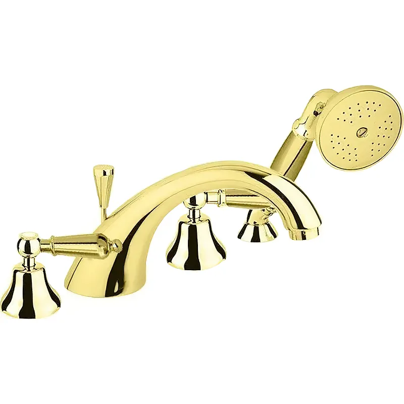 Смеситель на борт ванны Cezares First-BVD-03/24-M.Двухвентильный смеситель с фиксированным изливом и аэратором, монтируемый в четыре отверстия. Имеет долгий срок эксплуатации за счет качественных деталей, неприхотлив в уходе. Станет прекрасным дополнением ванной комнаты в классическом или ретро стиле.Характеристики: Цвет корпуса: золото 24 карат. Цвет ручек: золото 24 карат. Материал: латунь с гладким покрытием, которое не теряет цвет со временем, устойчиво к царапинам и превосходно защищает от коррозии. Управление: рычажное. Механизм: керамическая кран-букса. Отверстия для монтажа: 4 отверстия. Рабочий интервал давления: 0,5 - 6 Атм. Ручной выдвижной душ. Стандарт подключения: G 1/2. В комплекте поставки: Смеситель. Душевой шланг. Душевая лейка. Аэратор. Девиатор.