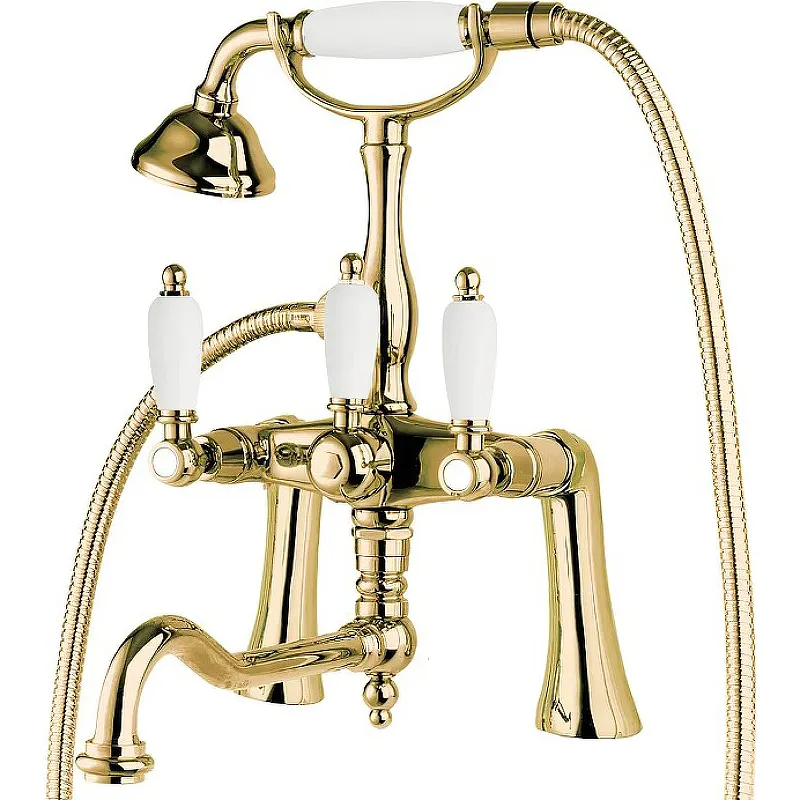 Смеситель на борт ванны Cezares First-PBV2-03/24-Bi.Двухвентильный смеситель с поворотным изливом и аэратором, монтируемый в два отверстия. Имеет долгий срок эксплуатации за счет качественных деталей, неприхотлив в уходе. Станет прекрасным дополнением ванной комнаты в классическом или ретро стиле.Характеристики: Цвет корпуса: золото 24 карат. Цвет ручек: белый. Материал: латунь с гладким покрытием, которое не теряет цвет со временем, устойчиво к царапинам и превосходно защищает от коррозии. Управление: вентильное. Механизм: керамическая кран-букса. Отверстия для монтажа: 2 отверстия. Рабочий интервал давления: 0,5 - 6 Атм. Стандарт подключения: G 3/4. В комплекте поставки: Смеситель. Душевой шланг. Душевая лейка. Универсальный установочный комплект. Дивертор.