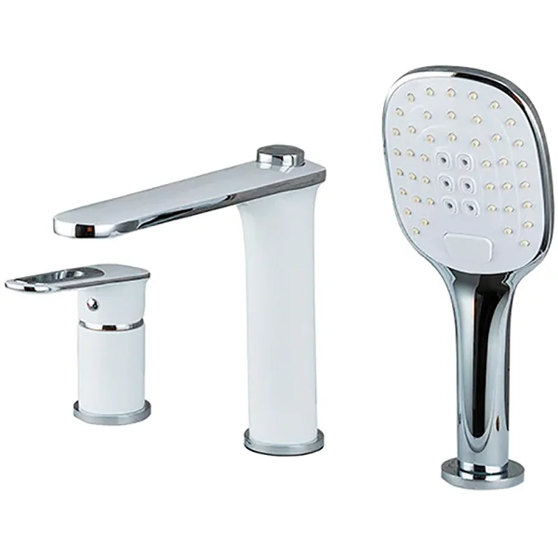 Смеситель на борт ванны Frap H49 F1149 с душевым гарнитуром.Характеристики: Цвет: белый, хром. Материал: латунь. Управление: однорычажное. Механизм: керамический картридж. Излив: фиксированный. Тип подводки: гибкая подводка. Стандарт подводки: G 1/2. Монтаж: на борт ванны. Отверстия для монтажа: 3. Выдвижная лейка душа. Длина душевого шланга: 2 м. В комплекте поставки: Смеситель. Душевой шланг. Ручная лейка.
