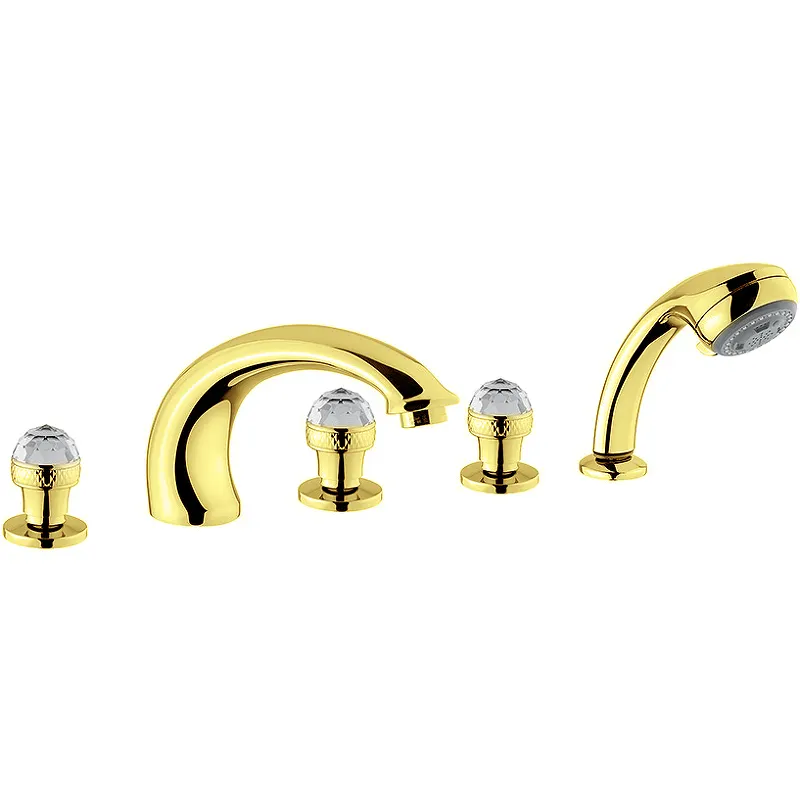 Смеситель на борт ванны Migliore Axo 18506 на 5 отверстий.Характеристики: Цвет: золото. Материал: высококачественный латунный сплав. Специальное лаковое покрытие защищает внешнюю часть смесителя от быстрого износа. Двухвентильная система управления. Ручки инкрустированы кристаллами Swarovski. Керамические кран-буксы. Фиксированный излив с аэратором. Стандарт подключения: G 1/2. Защита от обратного потока. Совместим с проточным водонагревателем. Отдельный вентильный переключатель ванна/душ. Душевой гарнитур: ручной душ, шланг, держатель. Монтаж: на 5 отверстий. В комплекте поставки: смеситель, гибкая подводка, лейка, шланг, держатель.