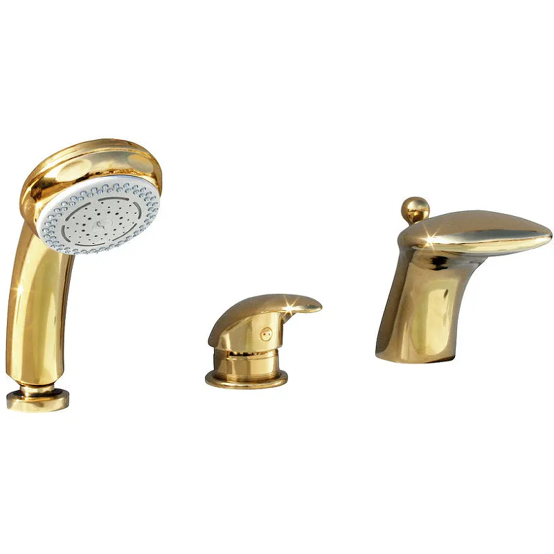 Смеситель на борт ванны Rav Slezak Dunaj D471.5SZ монолитный, с душевым гарнитуром, изготовлен из высококачественной латуни, которая исключает какую-либо коррозию.Характеристики: Цвет: золото. Материал: латунь. Управление: однорычажный. Механизм: керамический картридж 40мм КА4002, производство KEROX. Переключатель в изливе. Излив: фиксированный. Пластиковая душевая лейка с пятью режимами. Пластиковый шланг 2000 мм с пружиной. Стандарт подводки: 1/2. Отверстия для монтажа: 3. Монтаж: на борт ванны. В комплекте поставки: Смеситель. Душевая лейка. Шланг. Крепления.