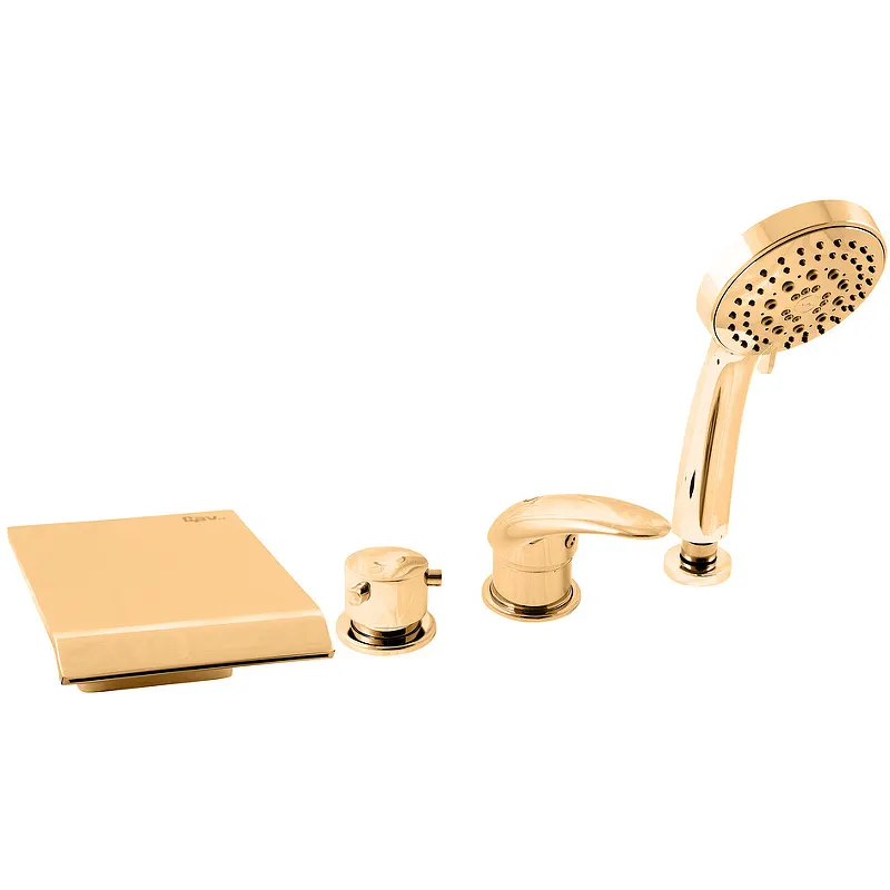 Смеситель на борт ванны Rav Slezak Dunaj D473.5PZ.Характеристики: Цвет: золото. Материал: латунь. Управление: однорычажный. Механизм: керамический картридж 40мм КА4002, производство KEROX. Керамический переключатель MD0448. Излив: фиксированный. Пластиковая душевая лейка с пятью режимами. Пластиковый шланг 2000 мм с пружиной. Стандарт подводки: 1/2. Отверстия для монтажа: 4. Монтаж: на борт ванны. В комплекте поставки: Смеситель. Душевая лейка. Шланг. Крепления.