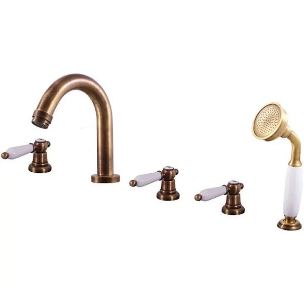 Смеситель для ванны Rav Slezak Morava retro MK562.5PSM - станет изысканным дополнением для ванн, имеющих 5 отверстий под каскадный смеситель. Модель смесителя выдержана в ретро стиле, чтобы элегантно сочетаться с классическим интерьером ванной комнаты.Особенности конструкции:Три керамические кранбуксы оснащенные картриджами MD0093. Излив. Лейка ручного душа со шлангом в металлической оплетке. Принцип установки:смеситель ставится в специальные посадочные места в ванной. Предусмотрены места для установки трех кранбукс, одного излива и ручного душа. Ручной душ оснащен пружиной, которая упрощает возвращение шланга в посадочное место.Конструкция: Покрытие: из бронзы. Ручки кранбукс: покрытие керамическое белого цвета. Материал: высокопрочная латунь. Механизм: керамический картридж. Подводка: гибкая, G 1/2. В комплекте поставки: Излив; Три кранбуксы с керамическими ручками; Ручная душевая лейка; Шланг в металлической оплетке с пружиной.
