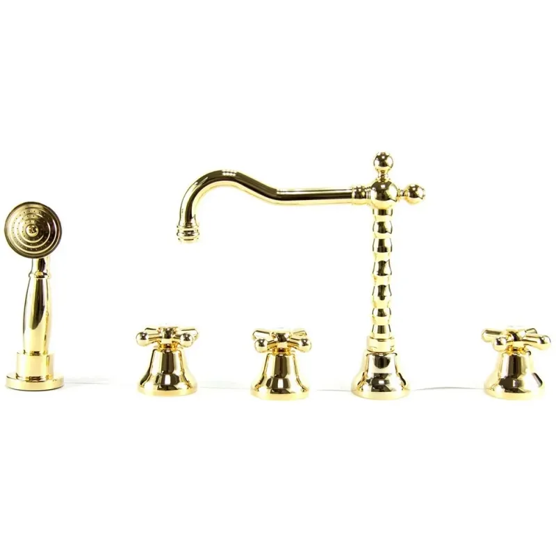 Смеситель на борт ванны Webert Armony AM730402010.Характеристики: Цвет: золото глянцевое. Материал: латунь. Управление: вентильное. Излив: поворотный. Механизм управления: керамическая кран-букса. Стандарт подводки: гибкая 1/2. Легкое очищение антиизвестковое покрытие. Аэратор с функцией самоочищения. Монтаж: на борт ванны. В комплекте поставки: Смеситель (внутренняя и внешняя части). Ручной душ. Душевой шланг.