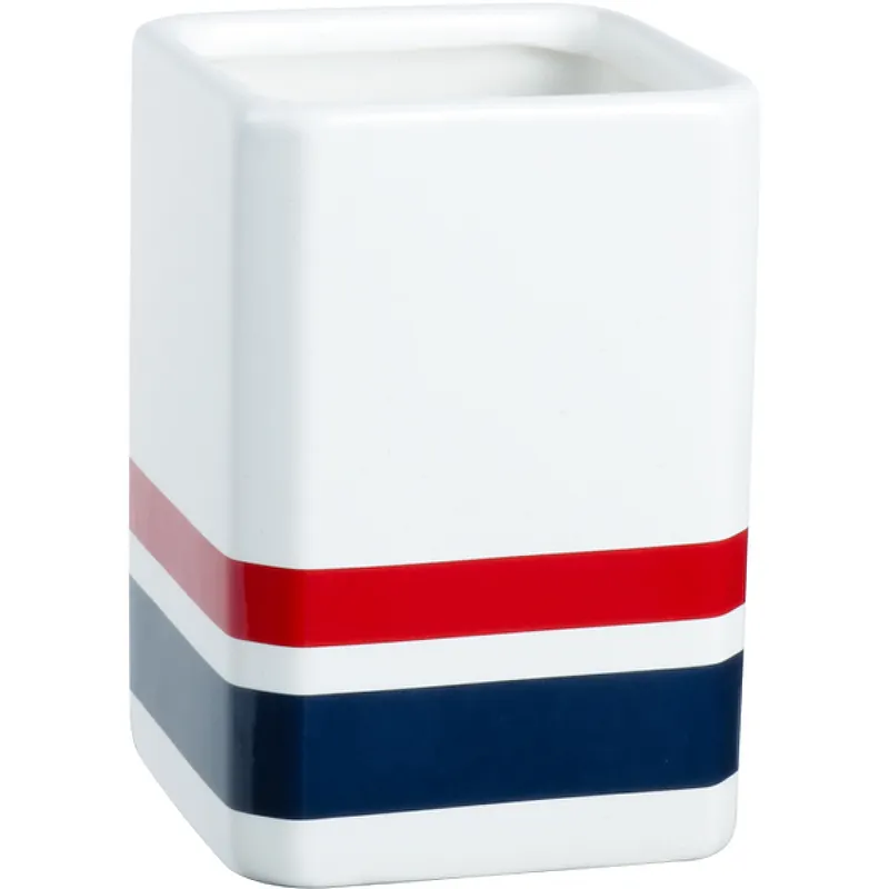 - Современный дизайн: Сочетание белого, синего и красного цветов делает данный стакан для зубных щеток стильным элементом декора.