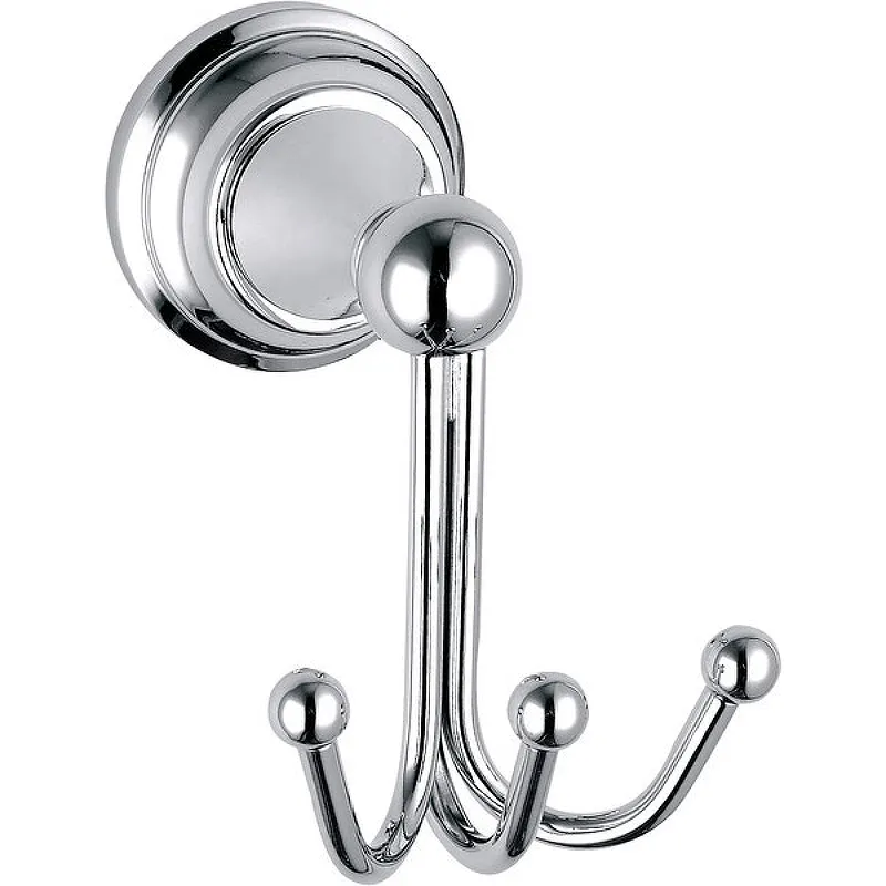 Тройной крючок Rav Slezak Morava MKA0105.Характеристики: Цвет: хром. Материал: латунь. Поверхность: глянцевая. Форма розетки: круглая. Монтаж: настенный. Размер (ШхВхГ): 82х116,5х115 мм. В комплекте поставки: Крючок тройной.