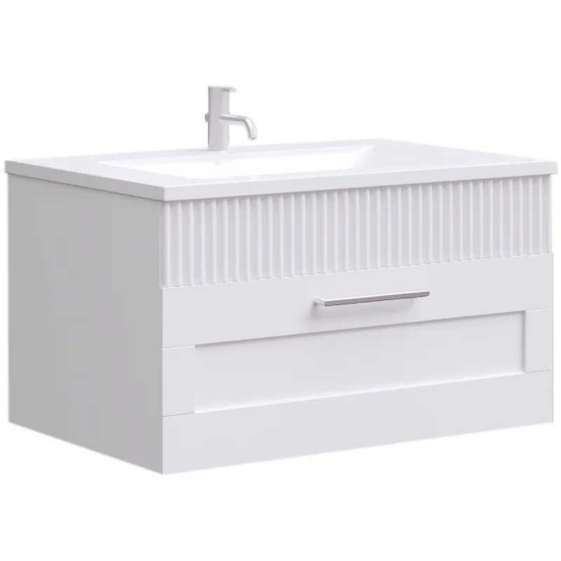 - Эстетичный современный стиль: Тумба и раковина белого цвета с декоративной 3D вставкой и хромированными ручками создают стильный и современный вид.