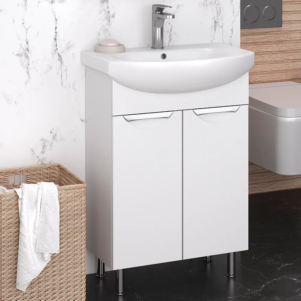Коллекция мебели ELEGANSE - для тех кто ценит комфорт и практичность. Серия выполнена в минималистическом стиле, поэтому не будет перегружать пространство и перетягивать на себя внимание. А благодаря деликатному акценту в виде хромированной или позолоченной врезной ручки мебель точно не будут смотреться скучно. Предметы из коллекций ELEGANSE выполнены в белом цвете и из высококачественных материалов, гарантирующих высокую износостойкость. Корпус и фасады покрыты полиакриловой эмалью бренда RENNER Italia, которая защищает мебель от воздействия влаги. Широкая размерная линейка комплектов (от 50 до 105см) дополняется универсальными навесными шкафчиками и пеналами. Тумба напольная ELEGANSE 60 с 2 распашными дверками, за которыми одна встроенная полочка. Дверки мягко и плавно закрываются благодаря петлям с доводчиком и удобным хромированным ручкам. Модель комплектуется фаянсовой раковиной Элеганс 60 /Rosa.