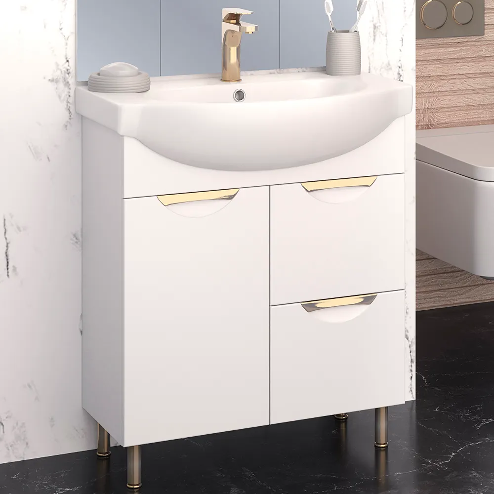 Коллекция мебели ELEGANSE - для тех кто ценит комфорт и практичность. Серия выполнена в минималистическом стиле, поэтому не будет перегружать пространство и перетягивать на себя внимание. А благодаря деликатному акценту в виде хромированной или позолоченной врезной ручки мебель точно не будут смотреться скучно. Предметы из коллекций ELEGANSE выполнены в белом цвете и из высококачественных материалов, гарантирующих высокую износостойкость. Корпус и фасады покрыты полиакриловой эмалью бренда RENNER Italia, которая защищает мебель от воздействия влаги. Широкая размерная линейка комплектов (от 50 до 105см) дополняется универсальными навесными шкафчиками и пеналами. Тумба напольная ELEGANSE 75 см оснащена 2 выдвижными ящиками и 1 распашной дверкой. Ящики на шариковых направляющих полного выдвижения. Слева - отделение с одной встроенной полкой. Удобные позолоченные ручки дают возможность легкого открытия фасадов. Модель комплектуется фаянсовой раковиной Элеганс 75 /KIROVIT.