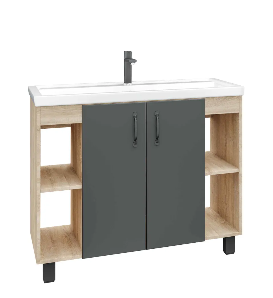 В тумбе Флай 100 см сочетаются контрастные цвета и фактуры: серый матовый фасад с покрытием SoftTouch, корпус цвета дуба с текстурой, черная матовая фурнитура. Открытые полки с 2х сторон обеспечивают быстрый доступ к аксессуарам, а пространство за распашными дверцами, снабженной системой плавного закрывания, станет удобным местом для хранения бытовых принадлежностей. Корпус тумбы выполнен из ЛДСП, фасад - из МДФ в матовой пленке, устойчивый к перепадам температур и высокой влажности. Черная металлическая ручка и 4 ножки (2 декоративных черных и 2 пластиковых) идут в комплекте с тумбой.