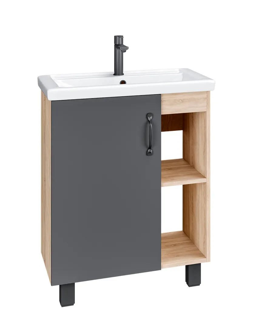 В тумбе Флай 60 см сочетаются контрастные цвета и фактуры: серый матовый фасад с покрытием SoftTouch, корпус цвета дуба с текстурой, черная матовая фурнитура. Открытые полки справа обеспечивают быстрый доступ к аксессуарам, а пространство за распашной дверцей, снабженной системой плавного закрывания, станет удобным местом для хранения бытовых принадлежностей. Корпус тумбы выполнен из ЛДСП, фасад - из МДФ в матовой пленке,устойчивый к перепадам температур и высокой влажности. Черная металлическая ручка и 4 ножки (2 декоративных черных и 2 пластиковых) идут в комплекте с тумбой.