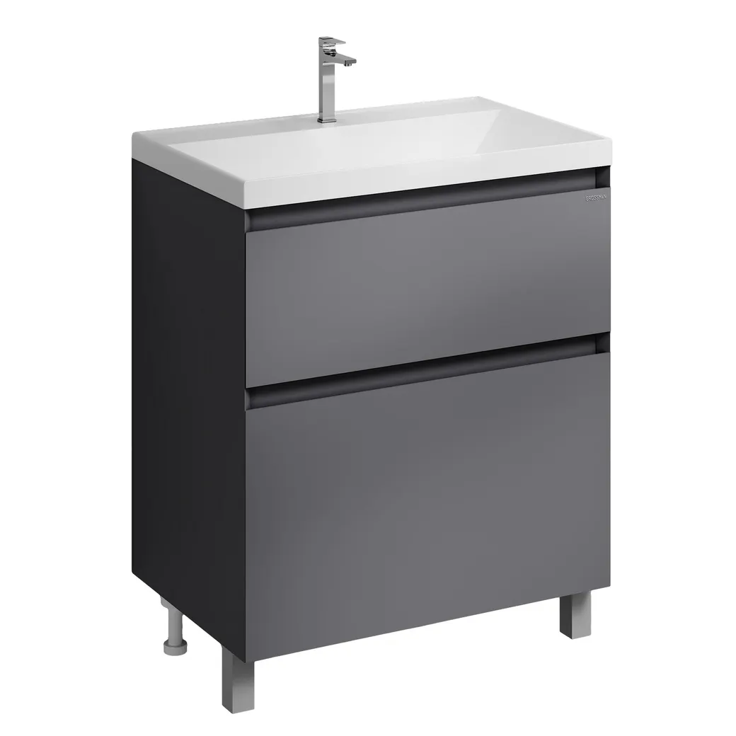 Тумба напольная для ванной «МЕРКАДО-70 см», графит матовый – стильное и функциональное решение для интерьеров в скандинавском и современном стиле. Корпус и фасады выполнены из МДФ в графитовой матовой краске. Фасады с точным запилом под 45° на торцах, что исключает видимую кромку и позволяет обходиться без ручек, создавая лаконичный и минималистичный дизайн. Два вместительных ящика изготовлены из ЛДСП «дуб Эльвезия» и оснащены направляющими скрытого монтажа с доводчиком, обеспечивающими плавное и бесшумное закрывание. Тумба установлена на хромированные ножки высотой 10 см, а для надежного крепления предусмотрены подвесы в комплекте. Модель совместима с умывальником Классика-70. Представлена в трёх размерах (60, 70, 80 см) и двух вариантах исполнения (напольная и подвесная). Отличный выбор для тех, кто ценит современный минимализм, практичность и высокое качество мебели для ванной комнаты.