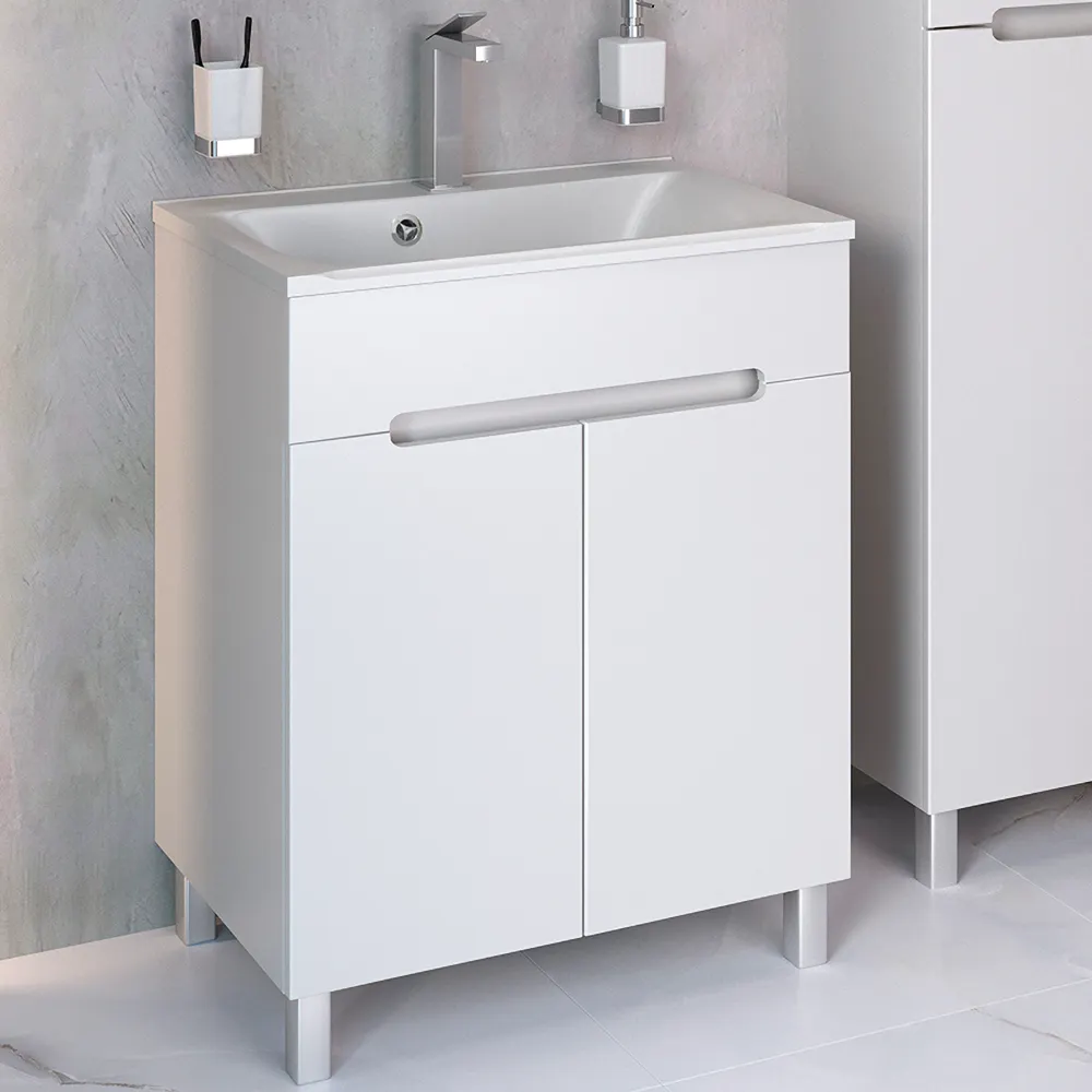 OLIVIA - коллекция мебели, сочетающая в себе современный дизайн и безупречное исполнение. Плавные линии, скругленные углы вырезов всех элементов придают ей легкость и воздушность, а продуманный функционал и система внутренней организации делают её удобной. Оптимальное решение для тех, кто мечтает о светлом и стильном интерьере в ванной комнате. Фасады и корпус мебели изготовлены из МДФ с лакокрасочным эмалевым покрытием, обладающим высокой устойчивостью к ультрафиолету, повышенной температуре и влажности. Тумба напольная OLIVIA 65см с 2 распашными дверками и одной встроенной полкой. Дверки легко открываются благодаря удобному вырезу на фасадах. Петли со встроенным доводчиком. Модель комплектуется умывальником из литьевого мрамора Прима 65см/ Florentina.
