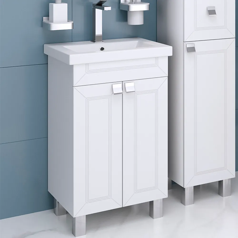 В моделях OSTIN белые глянцевые фасады с фрезеровкой повторяют правильные формы раковины и прекрасно гармонируют с изящными квадратными хромированными ручками. Простота форм, строгий геометрический рисунок на фасадах, отсутствие лишних декоративных элементов – вот отличительные черты данной коллекции. Фасад и корпус модели выполнены из МДФ и ЛДСП, облицованы глянцевой пленкой ПВХ, которая совершенно спокойно выдерживает любые влажные условия. Тумба OSTIN 50 см напольная с 2 распашными дверками, за которыми одна встроенная полочка. Дверки мягко и плавно закрываются благодаря петлям с доводчиком. Комплектуется фаянсовой раковиной Como 50см ТМ Cersanit.