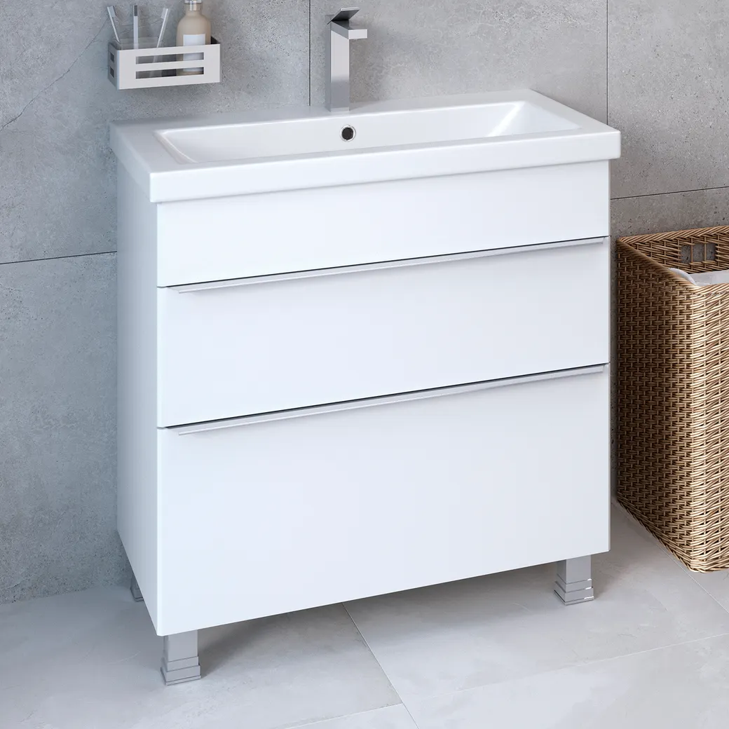 В основу коллекции AXIOMA заложены три основных качества современной мебели – легкость, оригинальность и практичность. Сочетание четких геометрические форм фасадов и хромированной профильной ручки отвечает идее лаконичности в дизайне и делает комплект актуальным по своему стилистическому решению. Фасады и корпус мебели изготовлены из МДФ с лакокрасочным эмалевым покрытием, обладающим высокой устойчивостью к ультрафиолету, повышенной температуре и влажности. Тумба напольная AXIOMA 80 с 2 выдвижными ящиками на шариковых направляющих скрытого монтажа с доводчиком. Ящики легко открываются благодаря удобным профильным ручкам, которые крепятся на торец фасадов по всей длине. Модель комплектуется фаянсовой раковиной Como 80см/ Cersanit.