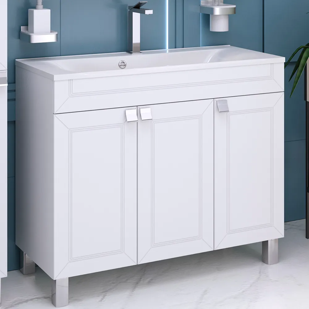 В моделях OSTIN белые глянцевые фасады с фрезеровкой повторяют правильные формы раковины и прекрасно гармонируют с изящными квадратными хромированными ручками. Простота форм, строгий геометрический рисунок на фасадах, отсутствие лишних декоративных элементов – вот отличительные черты данной коллекции. Фасад и корпус модели выполнены из МДФ и ЛДСП, облицованы глянцевой пленкой ПВХ, которая совершенно спокойно выдерживает любые влажные условия. Тумба OSTIN 100 см напольная с 3 распашными дверками, за которыми одна встроенная полочка. Дверки мягко и плавно закрываются благодаря петлям с доводчиком. Комплектуется умывальником из литьевого мрамора Прима 100см/ Florentina.