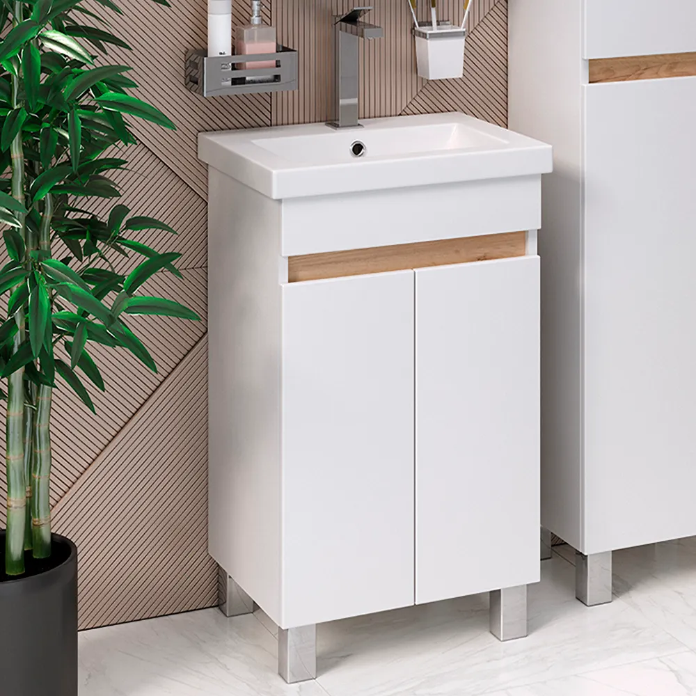 Коллекция SYDNEY особенно органично смотрится в интерьерах в скандинавском стиле. Широкий размерный ряд, удобный функционал и лаконичный изящный дизайн позволяют вписать коллекцию как в просторные ванные комнаты, так и небольшие. Фасад и корпус модели выполнены из МДФ и ЛДСП, облицованы глянцевой пленкой ПВХ, которая совершенно спокойно выдерживает любые влажные условия и устойчива к истиранию, выгоранию. Тумба SYDNEY 50 см напольная с 2 распашными дверками. Модель без ручек, дверки открываются благодаря нише между фасадами и фальш-панелью из ЛДСП в контрастной древесной отделке Дуб Крафт золотой. Тумба комплектуется фаянсовой раковиной Como 50см ТМ Cersanit. Петли со встроенным доводчиком.