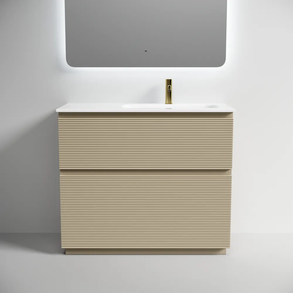Тумба напольная с рельефным фасадом SANCOS Folk Floor правая 995х445х850, c двумя ящиками оснащенными доводчиками скрытого монтажа с системой плавного закрывания, цвет Капучино, арт.FL100FRCP