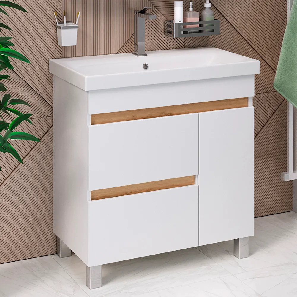 Коллекция SYDNEY особенно органично смотрится в интерьерах в скандинавском стиле. Широкий размерный ряд, удобный функционал и лаконичный изящный дизайн позволяют вписать коллекцию как в просторные ванные комнаты, так и небольшие. Фасад и корпус модели выполнены из МДФ и ЛДСП, облицованы глянцевой пленкой ПВХ, которая совершенно спокойно выдерживает любые влажные условия и устойчива к истиранию, выгоранию. Тумба SYDNEY 80 см напольная с 2 выдвижными ящиками и 1 распашной дверью. Модель без ручек, ящики и дверка открываются благодаря нише между фасадами и фальш-панелью из ЛДСП в контрастной древесной отделке Дуб Крафт золотой. Ящики на шариковых направляющих скрытого монтажа с доводчиком. Петли на дверце со встроенным доводчиком. Тумба комплектуется фаянсовой раковиной Moduo 80см ТМ Cersanit.