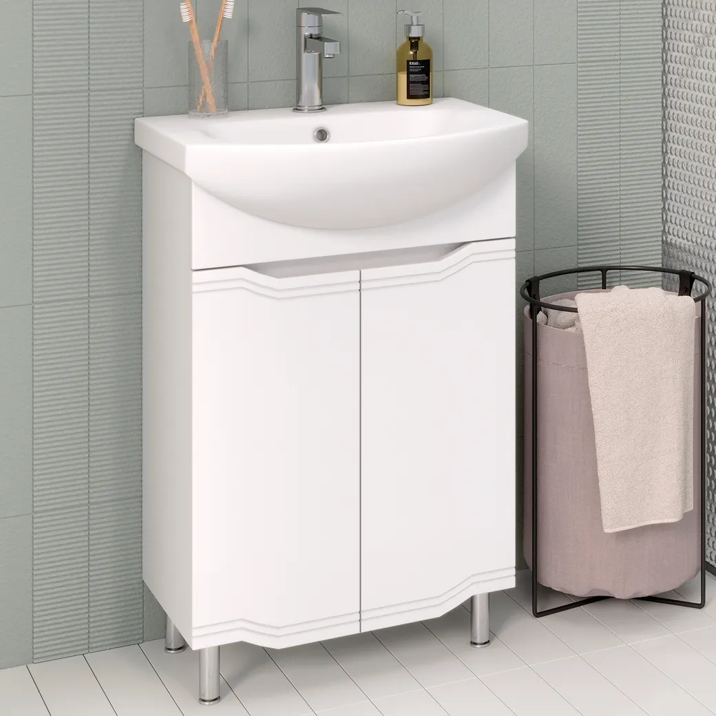 Коллекция мебели VIKTORIA выделяется своей изысканностью и простотой. Благодаря тонким элегантным линиям фрезеровок, плавным изгибам вырезов под ручку и удобной чаше овальной формы комплект смотрится легко и компактно в любом интерьере, не вызывая ощущения нагромождения. Для покрытия фасадов и боковин мебели использованы высококачественная полиуретановая эмаль и лак производства Италии, имеющие высокую устойчивость к механическим и климатическим нагрузкам. Повышенная влагостойкость не даёт воде испортить покрытие. Эмаль не пойдёт трещинами и не потеряет насыщенности цвета со временем. Тумба VIKTORIA 55 см напольная с 2 распашными дверками, за которыми одна встроенная полочка. Дверки мягко и плавно закрываются благодаря петлям с доводчиком. Комплектуется фаянсовой раковиной Элеганс 55см /TM Rosa.
