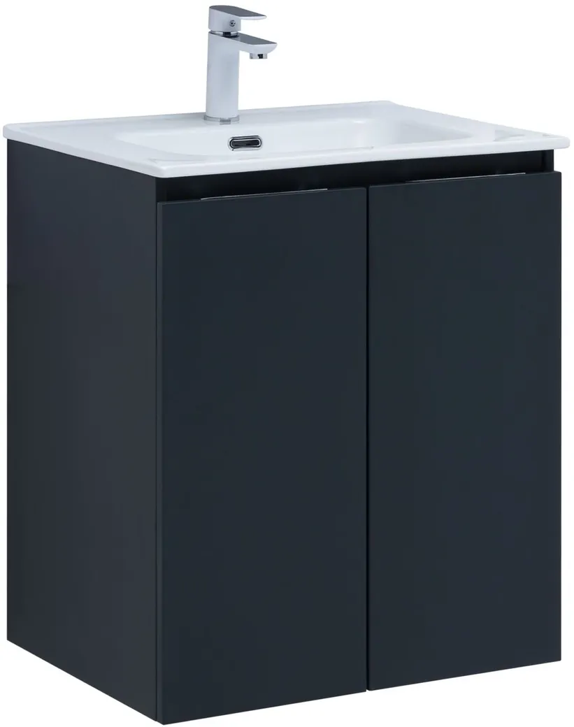 Тумба под раковину Aquanet «Алвита» New 60 выполнена в цвете «антрацит». Модель подвесная, крепится к стене. На лицевой стороне располагаются две дверцы, за которыми размещены полки для хранения средств бытовой химии, гигиенических и косметических принадлежностей. Корпус изготовлен из ЛДСП, устойчивого к высокому уровню влажности и не подверженного деформации. Размеры — 600х457х684 мм.