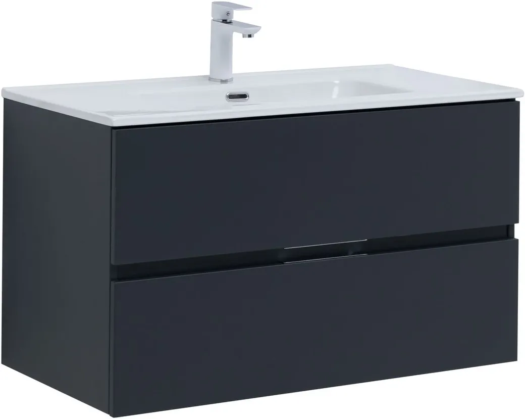 Тумба под раковину Aquanet «Алвита» New 90 оснащена двумя широкими ящиками со скрытыми ручками, создающими безопасные условия эксплуатации. Внутри достаточно пространства для размещения всех необходимых принадлежностей — средств гигиены, бытовой химии, косметики. Корпус изготовлен из материала ЛДСП, устойчивого к воздействию влаги, и окрашен в цвет «антрацит». Тумбу крепят к стене, благодаря чему обеспечивается простота уборки пола под ней. Размеры — 900х457х513 мм.