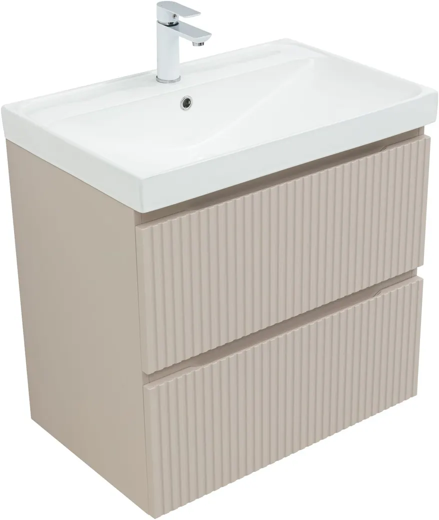 Тумба под раковину Aquanet Джейн (Flat) 70 бежевый — практичное и стильное решение для ванной комнаты. Корпус и фасады изготовлены из МДФ, покрытого суперматовой пленкой ПВХ повышенной прочности с эффектом «Soft touch». Покрытие не только приятное на ощупь, но и надежно защищает мебель от влаги. Полимерная структура пленки не пропускает воду, поэтому тумба не деформируется со временем и сохраняет первоначальный вид.