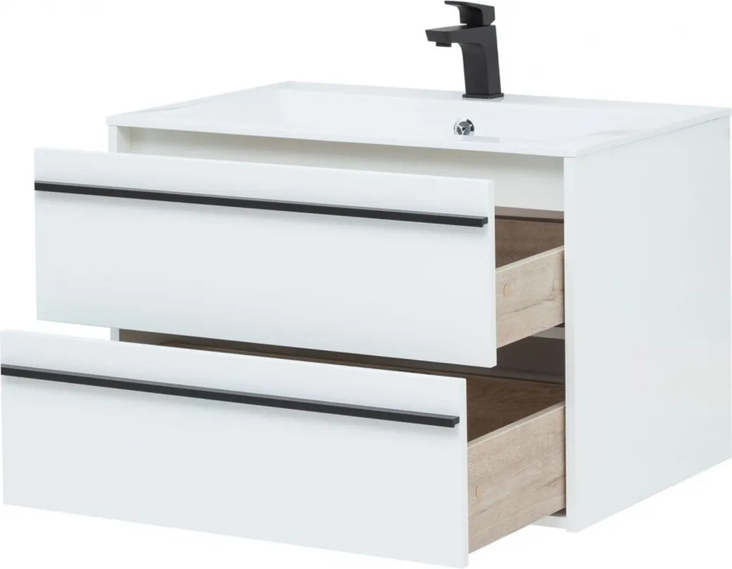 Тумба под раковину Aquanet Lino 80 белый матовый - яркий пример мебели в эко-стиле. У нее удобная зона хранения: два выдвижных ящика, оборудованных доводчиками, словно утоплены внутрь корпуса. Тонкие изящные ручки во всю ширину ящиков. Именно они находятся в одной плоскости с боковыми стенками. Выглядит стильно. К тому же, безопасно, так как нет выступающих деталей. Кстати, ручки отечественного производства. Сделаны из алюминия, чтобы исключить возможность коррозии, по заказу Aquanet специально для этой коллекции. Сверху на них нанесено эмалевое покрытие. Сверху – раковина «Электра» из литьевого мрамора. У нее максимально глубокая и объемная чаша, но все внутренние детали скруглены, так что приведение ее в порядок не составит труда, так как грязь не будет скапливаться в уголках. Корпус и фасады тумбы шириной 80 см – из влагостойкого ЛДСП, внутренняя часть ящиков выполнена в цвете «дуб кантри», что создает легкий контраст белоснежным деталям корпуса и фасада.