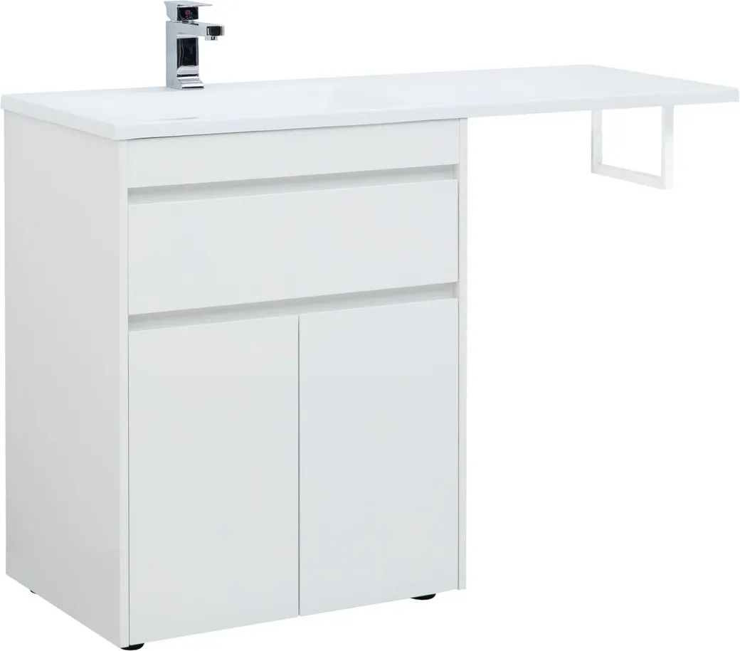 Тумба под раковину Aquanet Токио 130 (напольная, 1 ящик, 2 дверцы) белого цвета представляет новый формат тумб производства Aquanet. Раковина из литьевого мрамора имеет длинную платформу, которая выходит далеко за пределы тумбы. Она предназначена для того, чтобы установить с правой стороны от тумбы стиральную машину. Платформа имеет такую длину, которая позволит спрятать под нее машинку средних размеров с фронтальной загрузкой. Корпус тумбы выполнен из влагостойкого ЛДСП, а фасады – из МДФ с покрытием эмалью. Разнообразные зоны хранения в тумбе шириной 680 мм скрыты в ящике и за распашными дверками. Тумбу можно использовать и без соседства со стиральной машиной, а свободное пространство под платформой раковины занять подкатной тумбой, приспособлениями для уборки помещения или столиком.