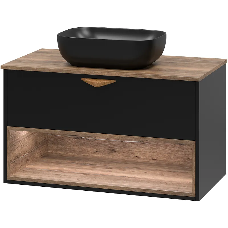 Тумба под раковину Brevita Bergen 90 BER-07090-19-02-1Я выполнена в современном стиле и идеально подходит для просторной ванной комнаты. Данная подвесная тумба с матовой черной поверхностью и древесным узором дуба Галифакс олово станет стильным и функциональным дополнением интерьера. Система хранения включает открытые полки и ящики, что делает ее практичным решением для вашего дома.