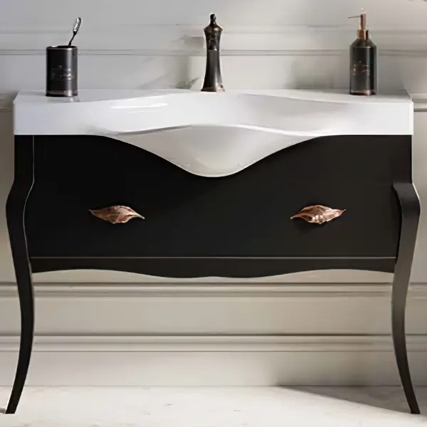 - Элегантный дизайн: Тумба в классическом стиле с черной патиной и медными элементами украсит любую ванную комнату.