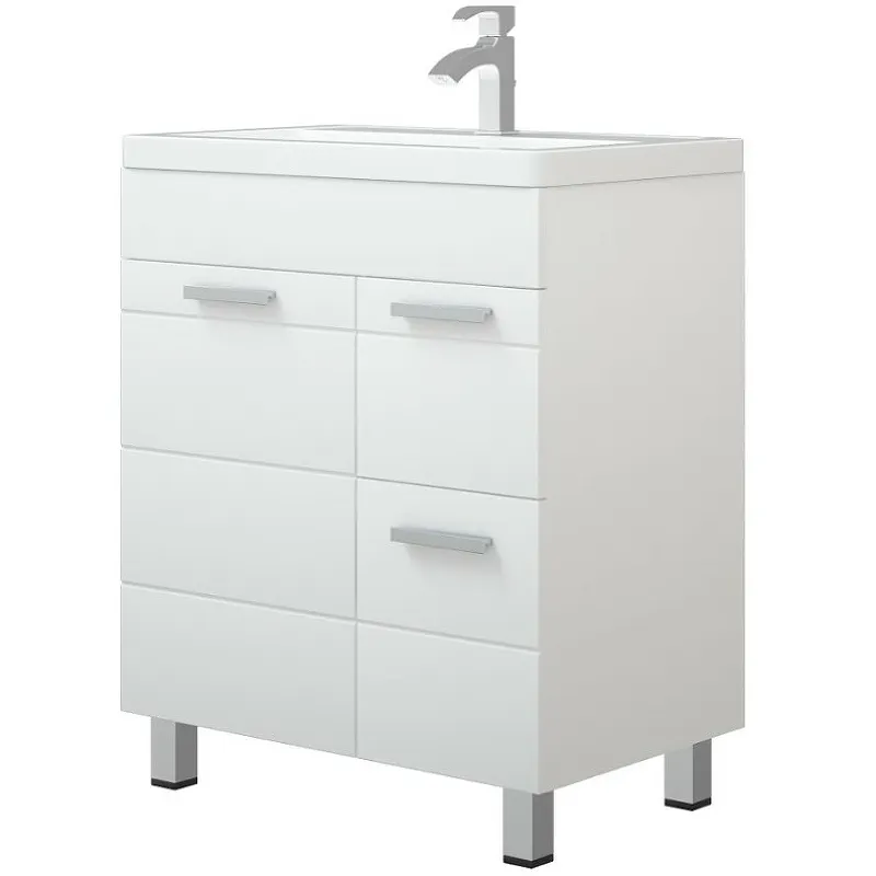- Функциональная система хранения: тумба с раковиной оснащена дверками и ящиками, что обеспечивает удобное хранение всех необходимых вещей.