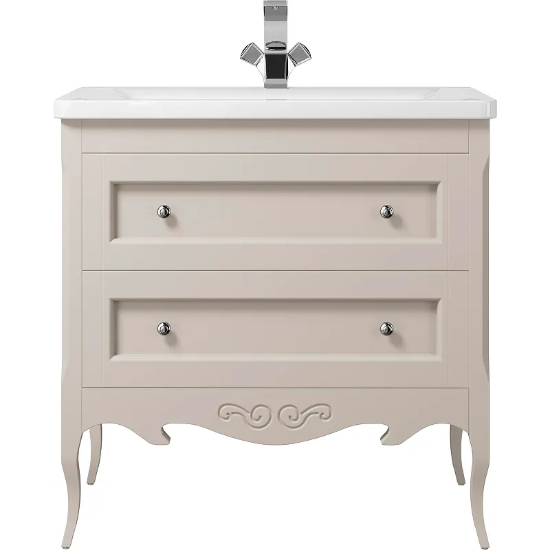 Тумба под раковину Creto Viva 85 13-1008O Olivine — идеальное решение для ванной комнаты. Данная напольная тумба под раковину выполнена в классическом стиле и обеспечивает удобство благодаря двум ящикам системы хранения. Материал корпуса представляет собой массив дуба и МДФ, что гарантирует долговечность и устойчивость к влажности.