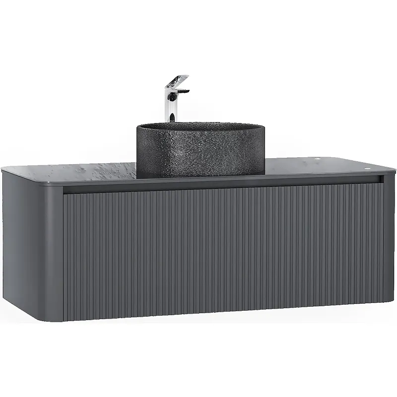 - Современный дизайн: Тумба с раковиной-чашей выполнена в антрацитовом цвете и обладает матовой поверхностью, что придаёт интерьеру ванной комнаты стильный и актуальный вид.