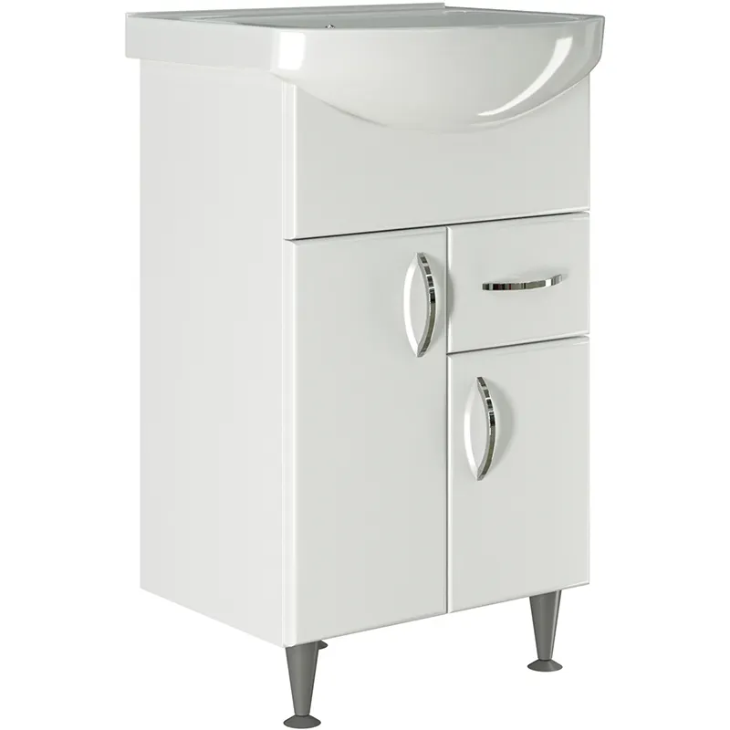 - Эргономичное хранение: Система хранения включает два распашных дверцы и один выдвижной ящик, что позволяет легко организовать пространство ванной комнаты.