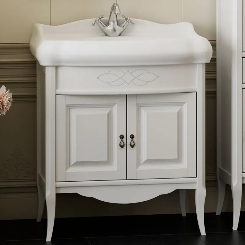 Тумба под раковину Opadiris Лоренцо 80 Z0000008220 — идеальное решение для ванной комнаты в классическом стиле. Выполненная из массива дерева и ЛДСП, она не только украсит интерьер, но и обеспечит удобство и функциональность. Белый матовый цвет и изящные резные узоры на фасаде придают изделию элегантности, а качественная фурнитура в цвете бронза добавляет шарма.