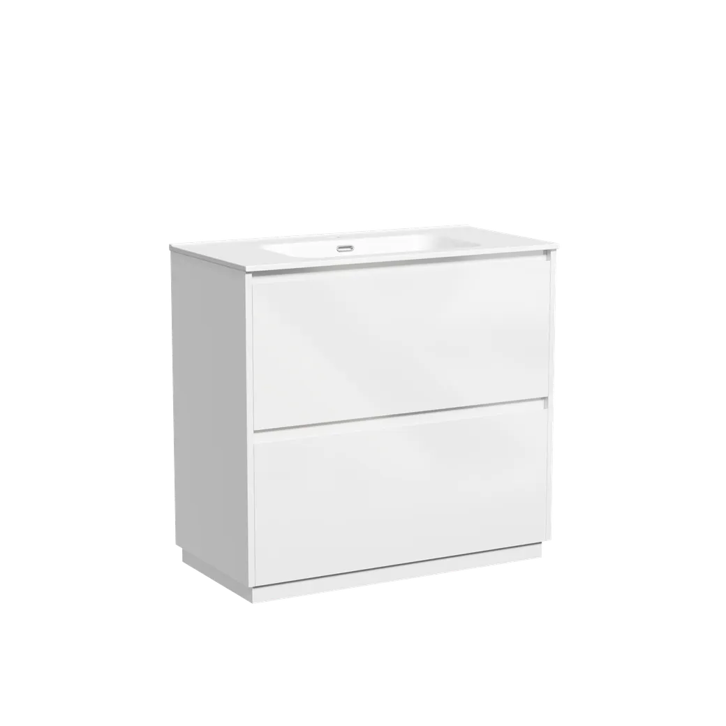 Тумба под раковину SANCOS Libra Floor напольная, 890х450х840 c двумя ящиками оснащенными доводчиками скрытого монтажа с системой Soft close (плавного закрывания), c фрезерованными ручками по всей длине фасада, белый глянец , арт. LB90FW