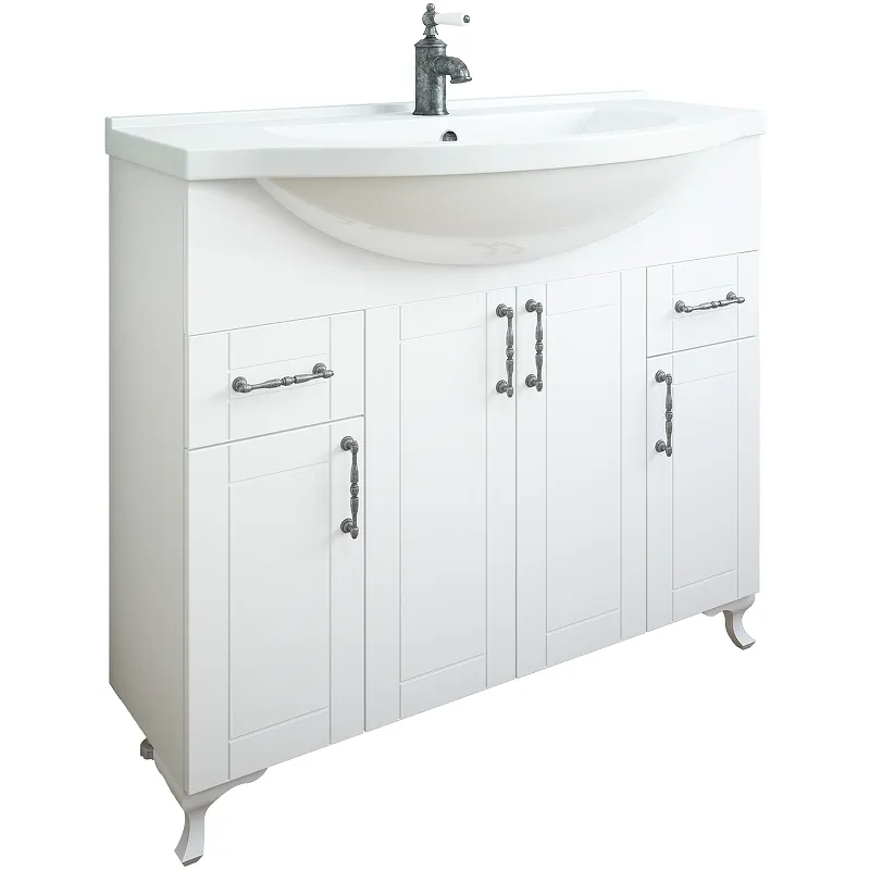 Тумба под раковину Sanflor Глория 105 объединяет эстетичный дизайн и функциональность. Напольная конструкция с матовой поверхностью выполнена из влагостойкой ЛДСП и МДФ, что обеспечивает долговечность и устойчивость к влаге. Идеально подходит для классических интерьеров, добавляя элегантности и комфорта в вашу ванную комнату.