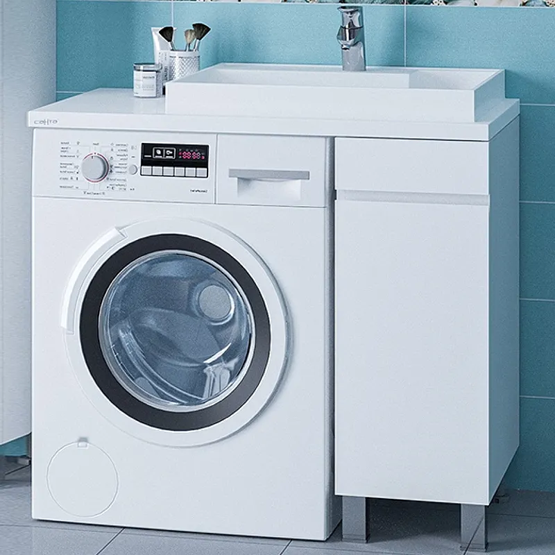 - Экономия пространства: Напольная тумба под раковину оптимально использует место в ванной комнате, устанавливаясь над стиральной машиной.