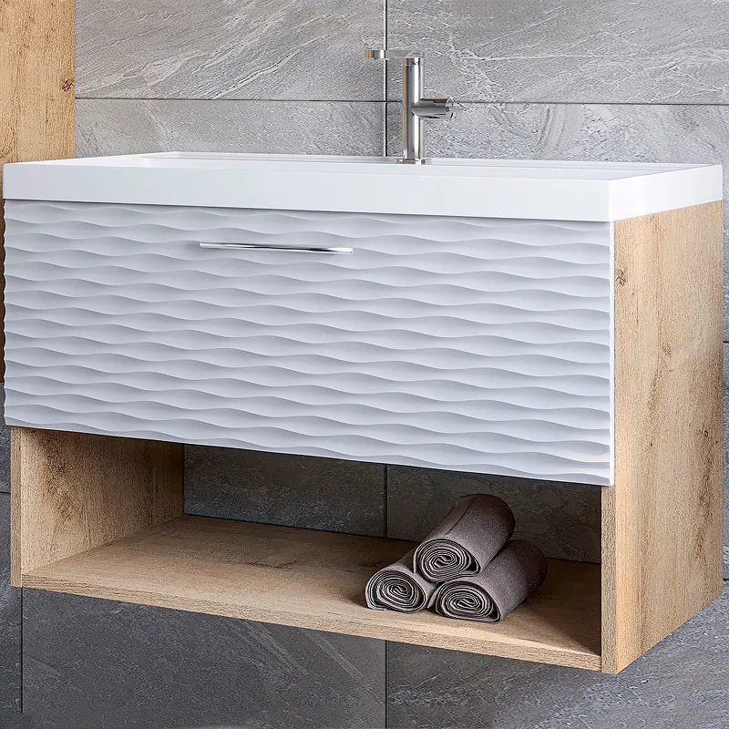 - Практичная система хранения: Тумба оснащена выдвижным ящиком и открытой полкой, что обеспечивает удобное хранение необходимых принадлежностей.