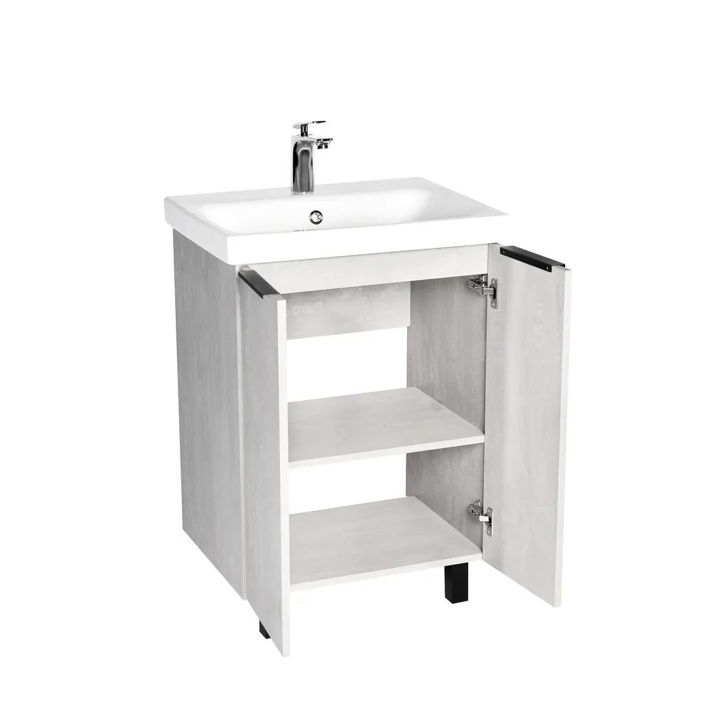 Тумба БЕРЛИН 60, напольная, 2 дв., цемент (под раковину СОМО 60, MODUO 60), VIANT. Комплектация: корпус, полки ЛДСП, 2 ножки черные металл, 2 ножки черный пластик.