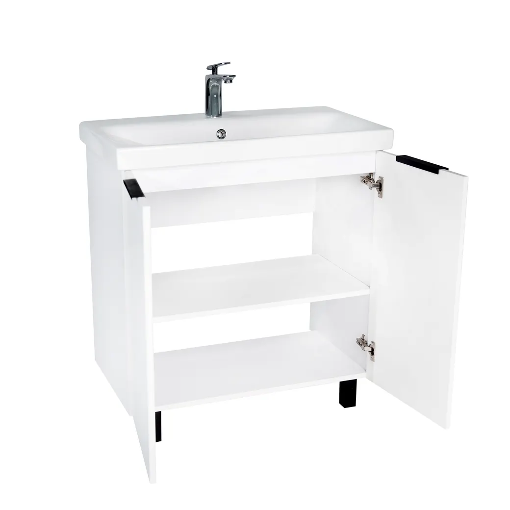 Тумба БЕРЛИН 80, напольная, 2 дв., белая (под раковину СОМО 80, MODUO 80), VIANT. Комплектация: корпус, полки ЛДСП, 2 ножки черные металл, 2 ножки черный пластик.